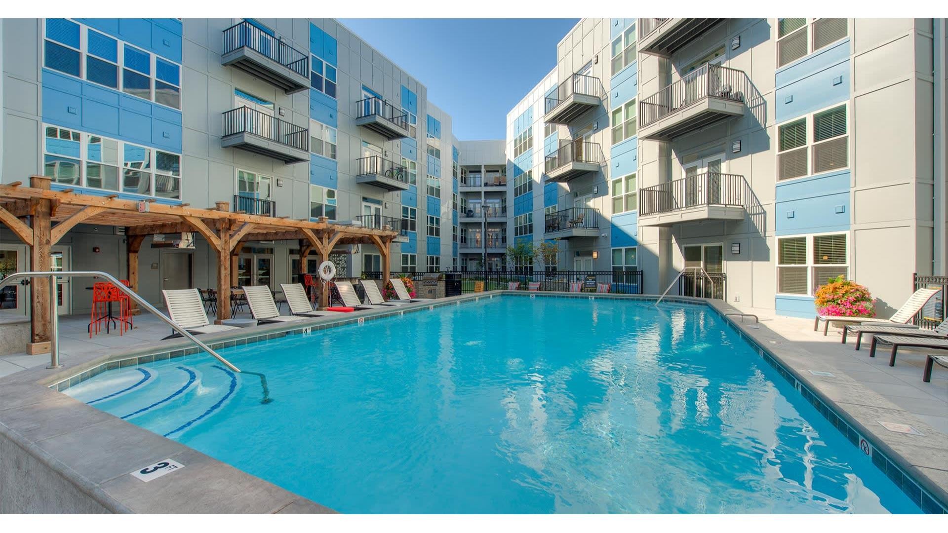 Amenities include: Outdoor pool, fitness center, in-unit washer/dryer, and resident lounge spaces.
