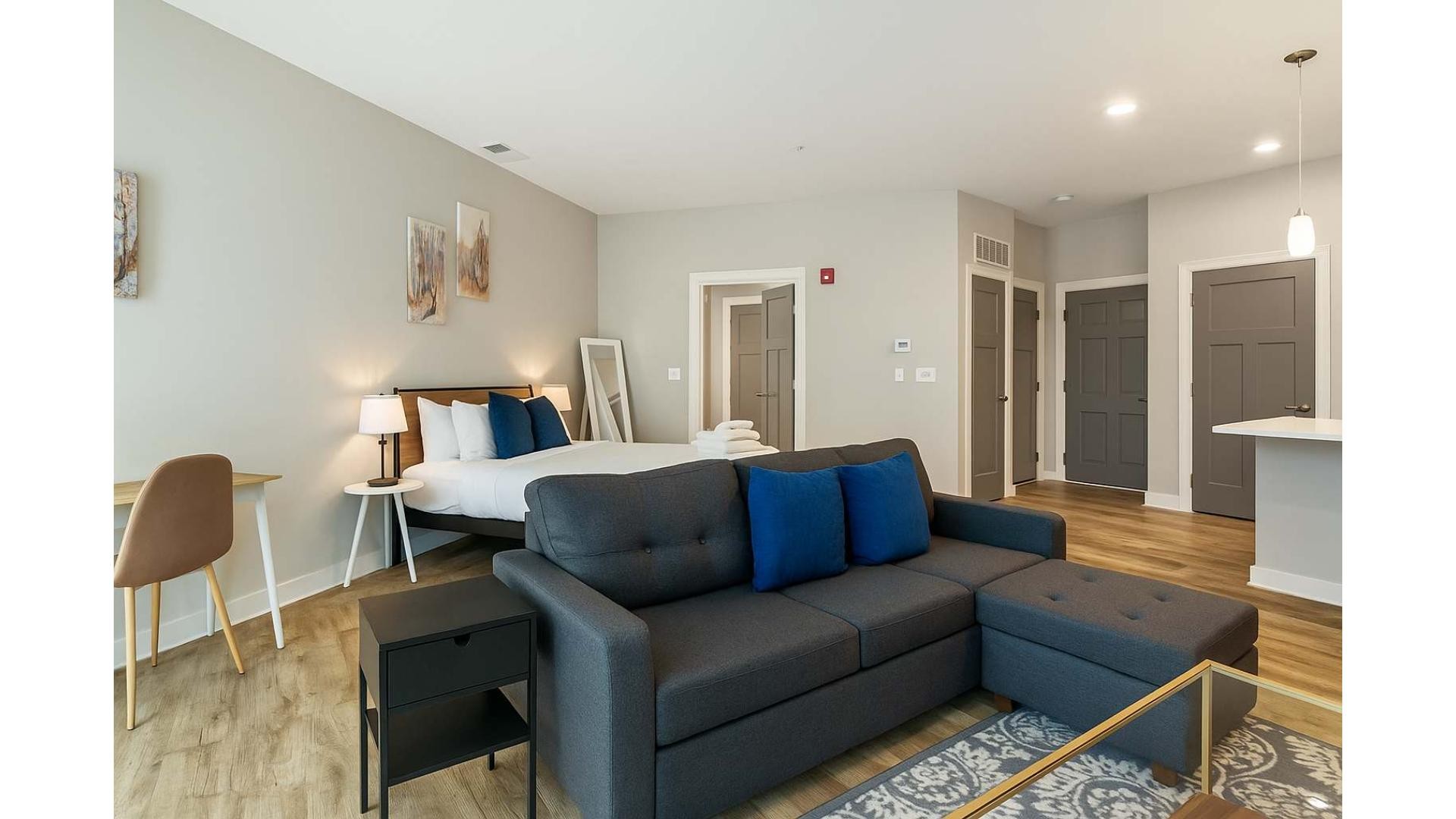 Choose from studio, 1-bedroom, 2-bedroom, or 3-bedroom units, perfect for business trips, groups, or getaways. Each space features a fully equipped kitchen, modern bathroom with toiletries, fast WiFi, Smart TV with streaming, and complimentary coffee. Layout and décor may vary slightly.