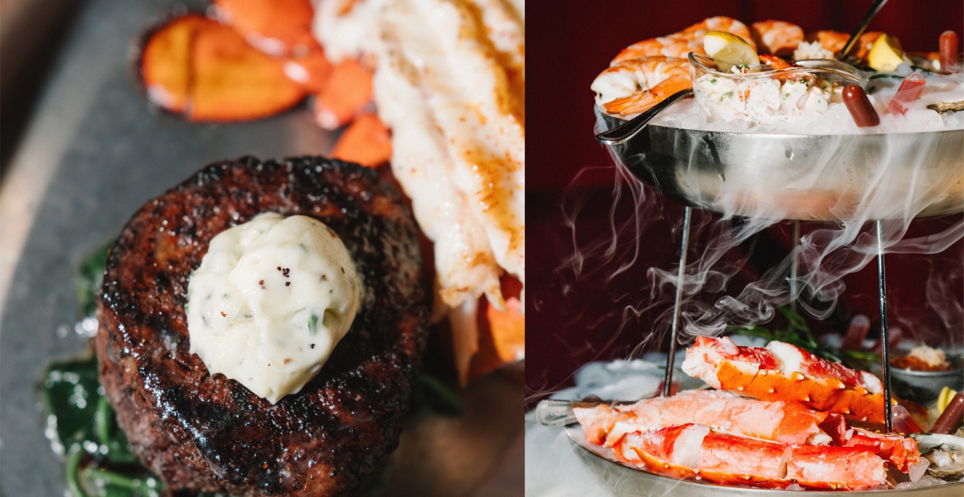 The restaurant includes seating for approximately 160 in the main dining room, 25 in a private dining room, and 50 across its lively cocktail and oyster bars. Interiors evoke the spirit of a timeless steakhouse, with rich dark woods, brass accents, and a dramatic, monochromatic palette. Thoughtfully color-blocked with deep reds and saturated blues, the design strikes an inviting balance of comfort and elegance.
