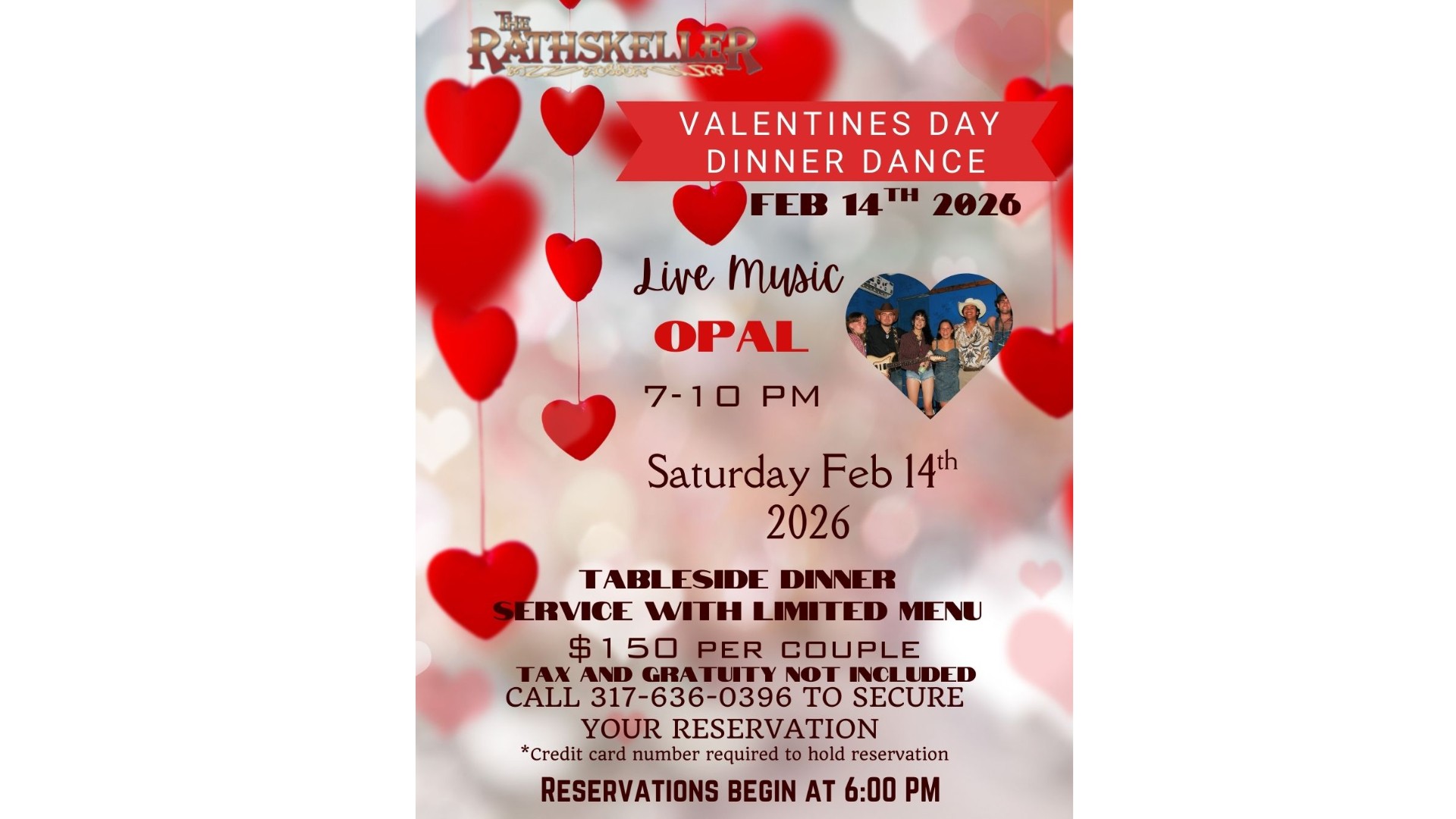 Annual Valentine’s Day Dinner & Dancing. 4 Course Tableside Dinner Service $150 per couple- tax and gratuity not included. Call 317-636-0396 to make your reservation. Live music with Opal 7-10 pm- Credit card number required to hold reservation.