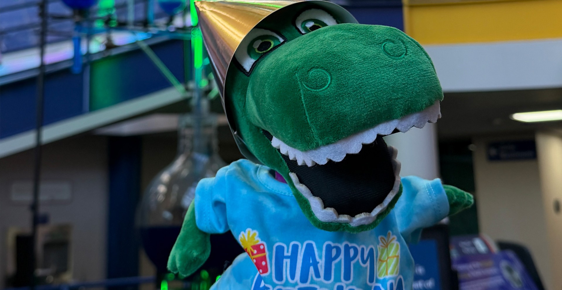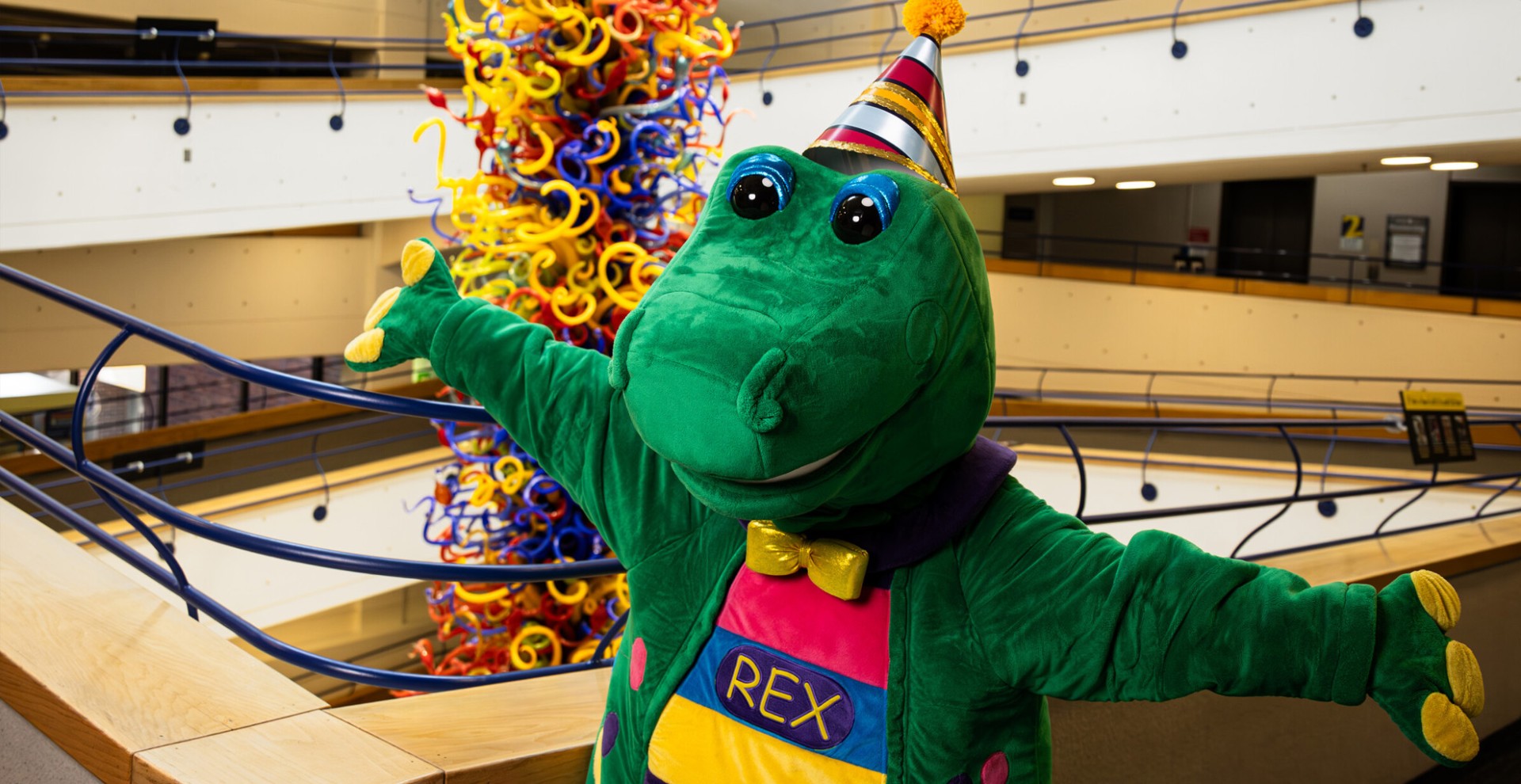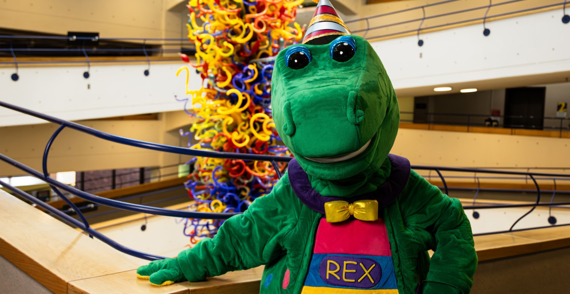 Wear your birthday best as you don a birthday hat and gather party favors (while supplies last) given out as you enter the museum. Play I Spy with 10 plush hidden Rexes, be awed by a roving magician, let loose in a centennial dance party with popular songs from the last 10 decades, meet interesting critters in Hedgehog Hannah’s interactive animal show, enjoy a speed sketcher as they draw free caricatures, enjoy a slice of birthday cake for purchase, learn from our Visiting Artist or our Visiting Scientist in the STEM lab, pin the birthday hat on Rex, participate in party games, and more!