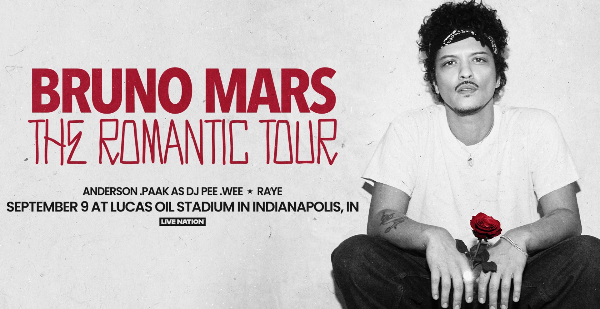 Joining Mars across all dates is nine-time GRAMMY® award-winning artist and Silk Sonic collaborator Anderson .Paak as DJ Pee .Wee. Additional support in Indianapolis will be provided by RAYE.