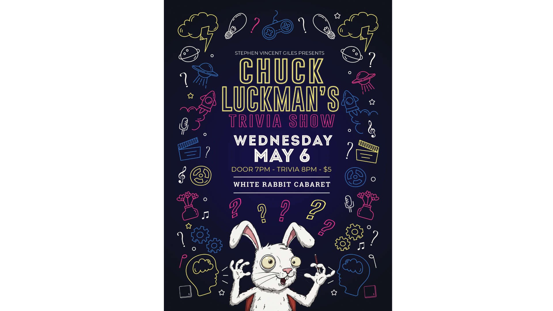 Chuck Luckman has created a lively, interactive show that blends the fun of pub trivia with the excitement of a game show and the energy of live performances. Part quiz night, part variety show, it features fast-paced trivia rounds, quirky challenges, surprise audience participation, and live music or comedy acts. Whether you're a trivia buff or just in it for the laughs, this is a night of spontaneous fun, friendly competition, and unforgettable entertainment.