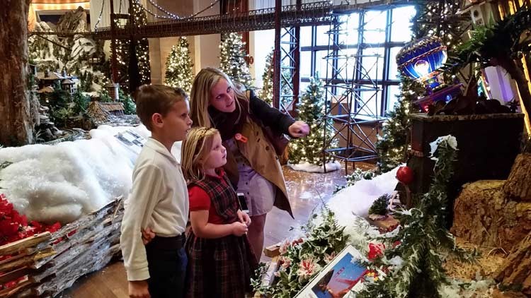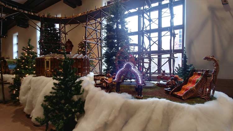 As you explore Jingle Rails and take in the different scenes, see what materials you can find within the backdrops. You may find miniature buildings made of twigs, sycamore leaves, pinecone scales, walnut shells, or cinnamon sticks.