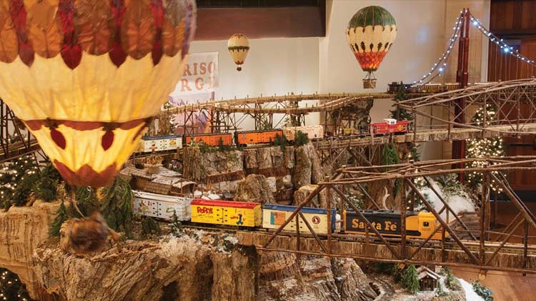 A beloved annual holiday tradition, Jingle Rails: The Great Western Adventure presented by Fifth Third Bank is a breathtaking model train display featuring eight G-scale trains traveling through spectacular landscapes and past famous landmarks of Indianapolis and the American West. Each scene is masterfully crafted from natural materials and adorned with festive holiday decorations and twinkling lights, creating a magical experience for visitors of all ages.
