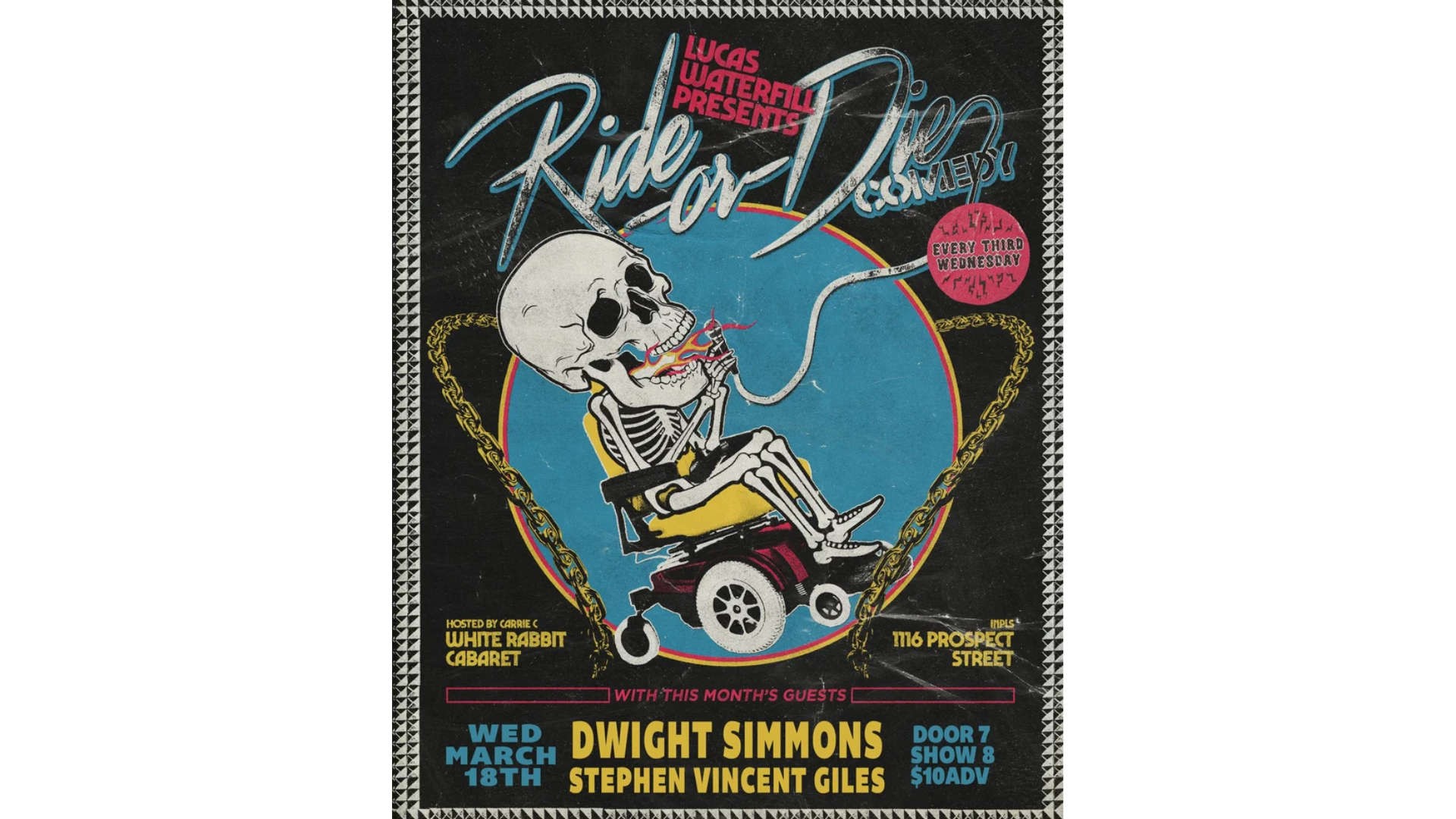 Lucas Waterfill presents Ride or Die, a monthly standup comedy showcase at the White Rabbit Cabaret.