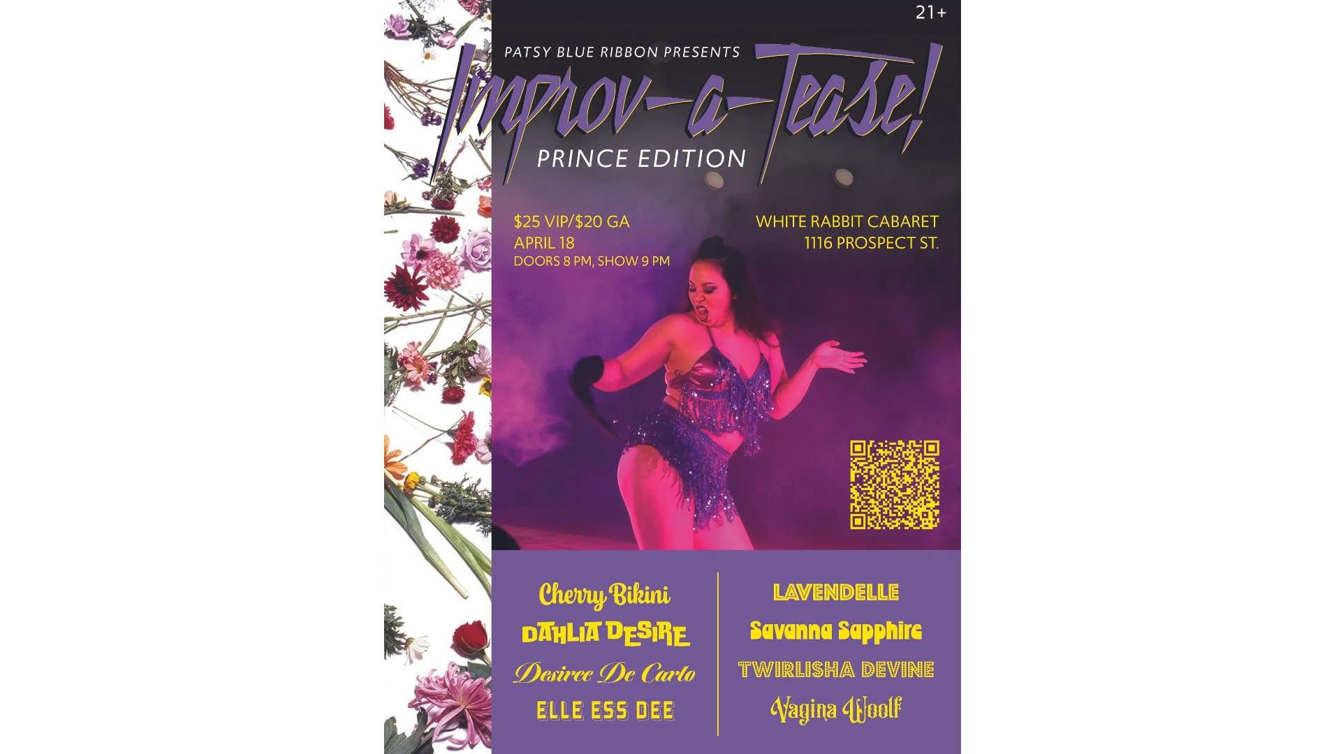 Patsy Blue Ribbon presents Improv-a-Tease! This strip-show combines everything you love about burlesque and adds a twist. The performers are given a random song and a random prop at the moment of their performance and are challenged to create an act on the spot. Hilarity ensues! This time we're celebrating the music of PRINCE! You know the hits, but no one knows what's going to happen on stage. It may get beautiful, sensual, funny, crazy, or all of the above, but will definitely be dazzling and "Delirious". Prepare to be entertained by the unexpected.