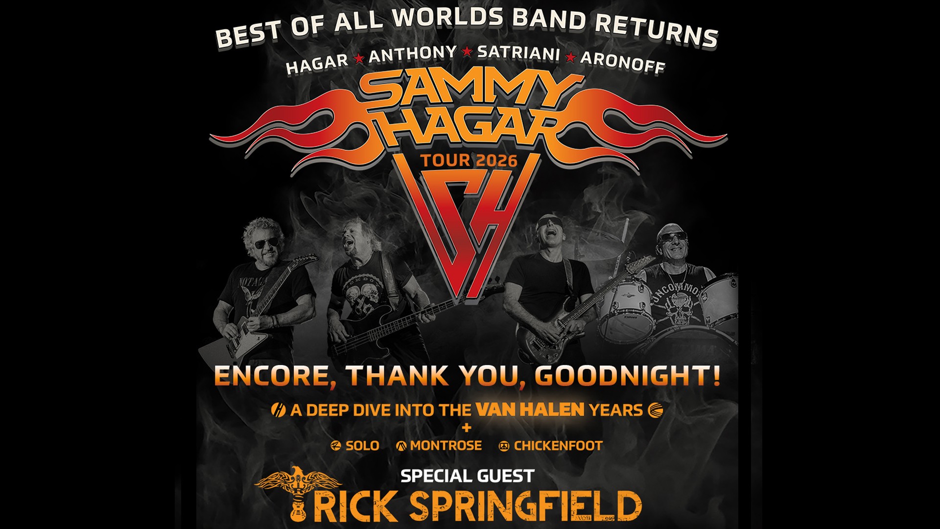 Following two years of overwhelming fan demand, Rock & Roll Hall of Famer Sammy Hagar returns this summer with a special limited run of his acclaimed, top-grossing Best of All Worlds Tour. Hagar will be joined by rock heavyweights and longtime bandmates Michael Anthony (bass, backing vocals), Joe Satriani (guitar), and Kenny Aronoff (drums) as well as special guest Rick Springfield as the opener.