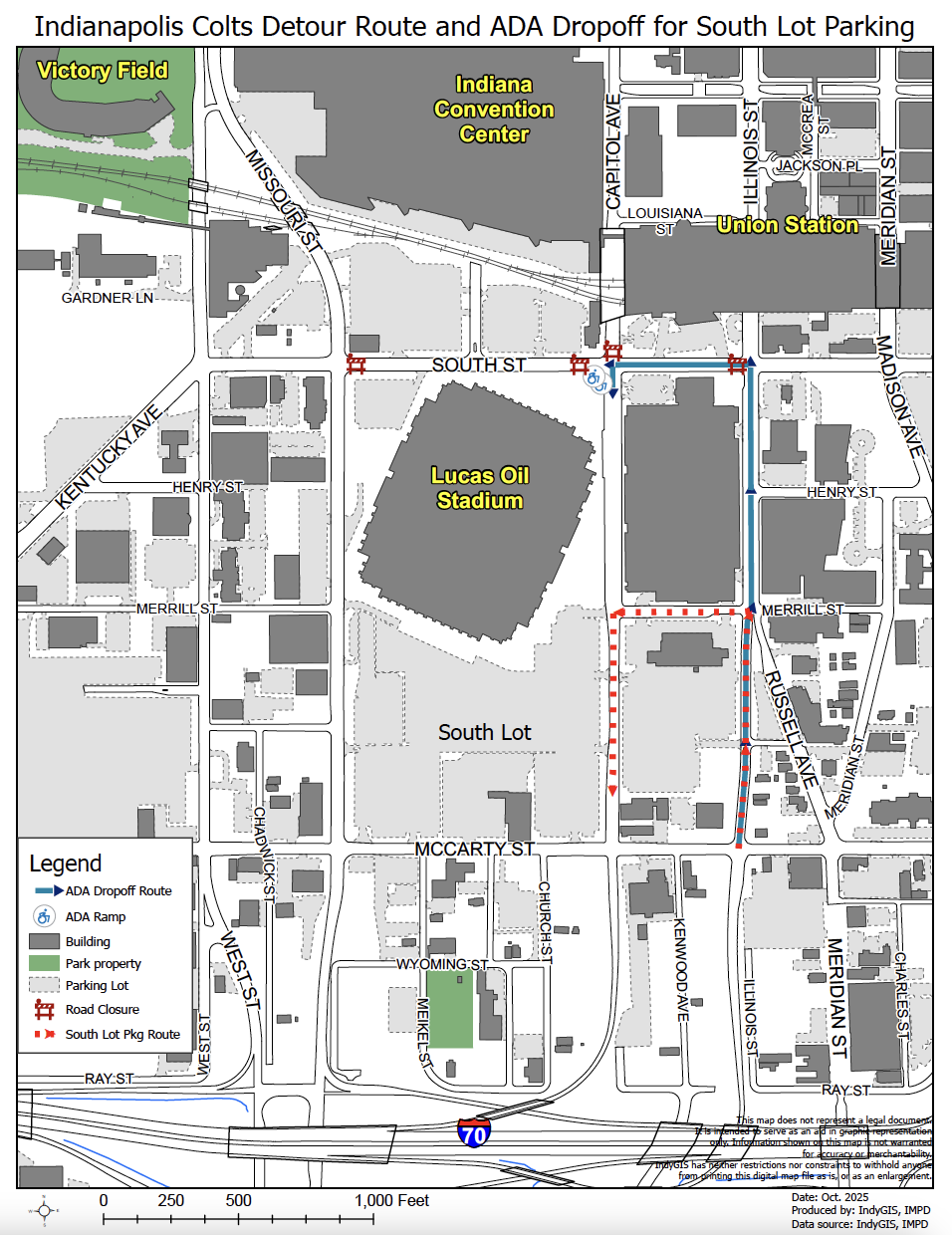 South Capitol Avenue is currently inaccessible to vehicular traffic from West Maryland Street. South Street just north of Lucas Oil Stadium will close at 6:00 a.m. ET on game day and will remain closed until after the game ends and traffic is restored to normal flow.