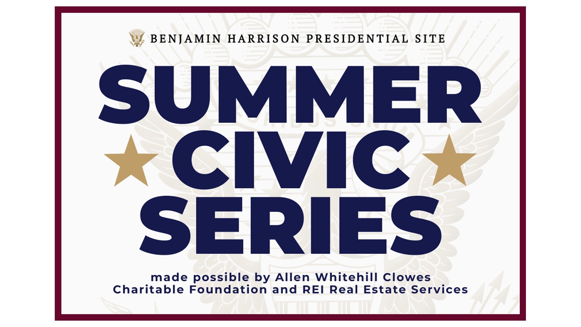 The Summer Civic Series brings together the Benjamin Harrison Presidential Site’s signature summer programs under a shared purpose: exploring how civic life is built – not only through laws and elections, but through community, culture, conversation, and care for one another.