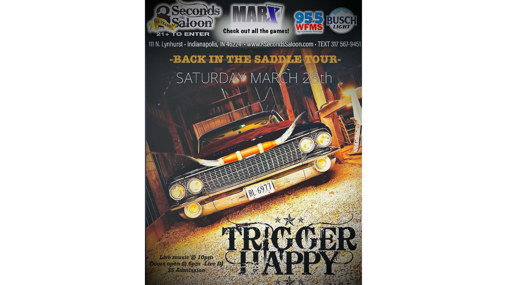 Share Home Trigger Happy Mar 28 10:00 PM Go To Website Save Map for Directions Trigger Happy111 N. Lynhurst Dr. Indianapolis, Indiana 46224 United StatesDetailsOpen in Google Maps 8 Seconds Saloon 111 N. Lynhurst Dr. Indianapolis, Indiana 46224 Speedway Overview Trigger Happy 10 year Reunion Show Map Map Upcoming Events at 8 Seconds Saloon Mar 4 Save Map for Directions Dance NIght111 N. Lynhurst Dr. Indianapolis, Indiana 46224 United StatesDetailsOpen in Google Maps Speedway Dance NIght 8 Seconds Saloon Website Learn More Mar 6 Save Map for Directions Britnee Kellogg111 N. Lynhurst Dr. Indianapolis, Indiana 46224 United StatesDetailsOpen in Google Maps Speedway Britnee Kellogg 8 Seconds Saloon Website Learn More Mar 7 Save Map for Directions Pecos & the Rooftops111 N. Lynhurst Dr. Indianapolis, Indiana 46224 United StatesDetailsOpen in Google Maps Speedway Pecos & the Rooftops 8 Seconds Saloon Website Learn More Mar 11 Save Map for Directions Dance NIght111 N. Lynhurst Dr. Indianapolis, Indiana 46224 United StatesDetailsOpen in Google Maps Speedway Dance NIght 8 Seconds Saloon Website Learn More Mar 13 Save Map for Directions Dance NIght111 N. Lynhurst Dr. Indianapolis, Indiana 46224 United StatesDetailsOpen in Google Maps Speedway Dance NIght 8 Seconds Saloon Website Learn More Mar 14 Save Map for Directions Tyler Farr111 N. Lynhurst Dr. Indianapolis, Indiana 46224 United StatesDetailsOpen in Google Maps Speedway Tyler Farr 8 Seconds Saloon Website Learn More Mar 18 Save Map for Directions Dance NIght111 N. Lynhurst Dr. Indianapolis, Indiana 46224 United StatesDetailsOpen in Google Maps Speedway Dance NIght 8 Seconds Saloon Website Learn More Mar 20 Save Map for Directions Dance NIght111 N. Lynhurst Dr. Indianapolis, Indiana 46224 United StatesDetailsOpen in Google Maps Speedway Dance NIght 8 Seconds Saloon Website Learn More Mar 21 Save Map for Directions Midnight Red Eye111 N. Lynhurst Dr. Indianapolis, Indiana 46224 United StatesDetailsOpen in Google Maps Speedway Midnight Red Eye 8 Seconds Saloon Website Learn More Mar 27 Save Map for Directions Jason Michael Carroll111 N. Lynhurst Dr. Indianapolis, Indiana 46224 United StatesDetailsOpen in Google Maps Speedway Jason Michael Carroll 8 Seconds Saloon Website Learn More Mar 28 Save Map for Directions Trigger Happy111 N. Lynhurst Dr. Indianapolis, Indiana 46224 United StatesDetailsOpen in Google Maps Speedway Trigger Happy 8 Seconds Saloon Website Learn More Apr 3 Save Map for Directions Jon Langston111 N. Lynhurst Dr. Indianapolis, Indiana 46224 United StatesDetailsOpen in Google Maps Speedway Jon Langston 8 Seconds Saloon Website Learn More